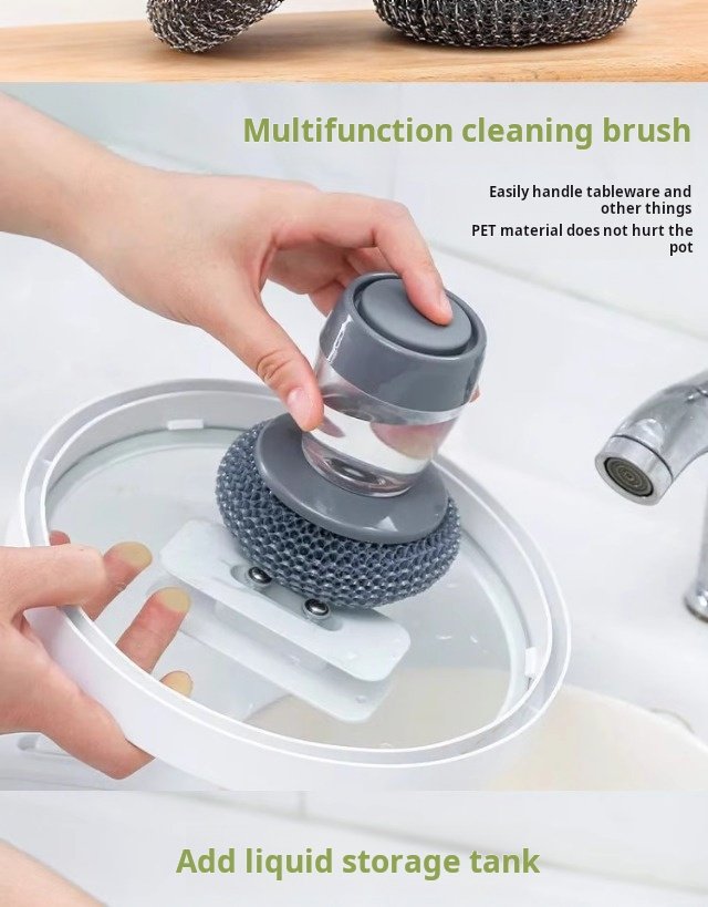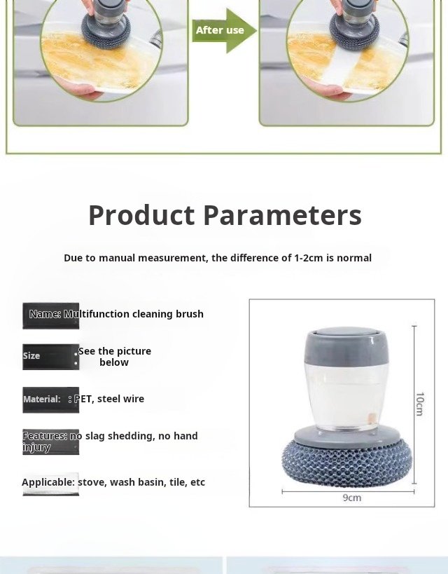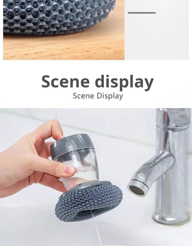 It is very easy to use. You don’t need to get your hands wet. It is better than steel wool. But when you wash the pot, don’t squeeze the water into the place where you squeeze the detergent, otherwise you can’t fill it with water.